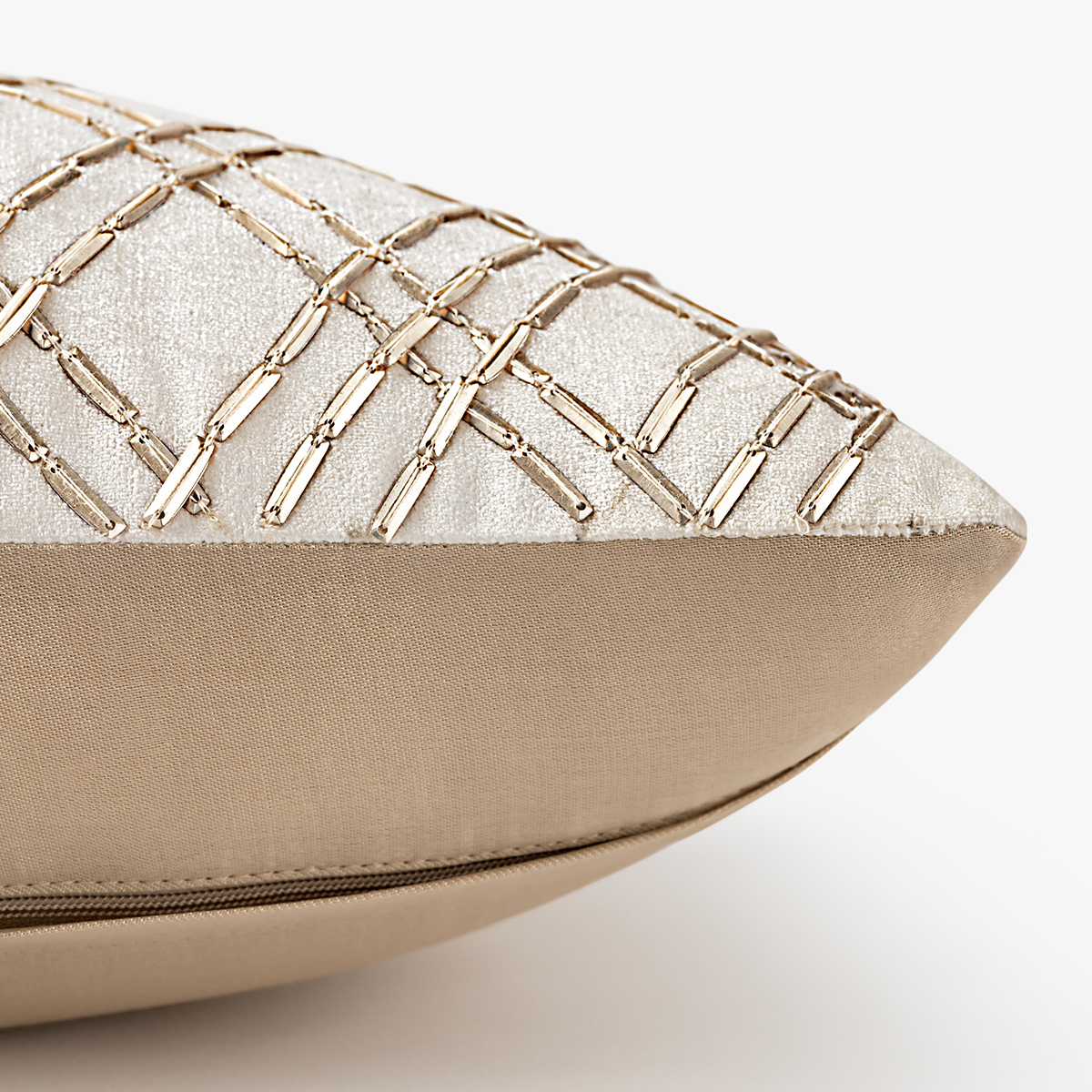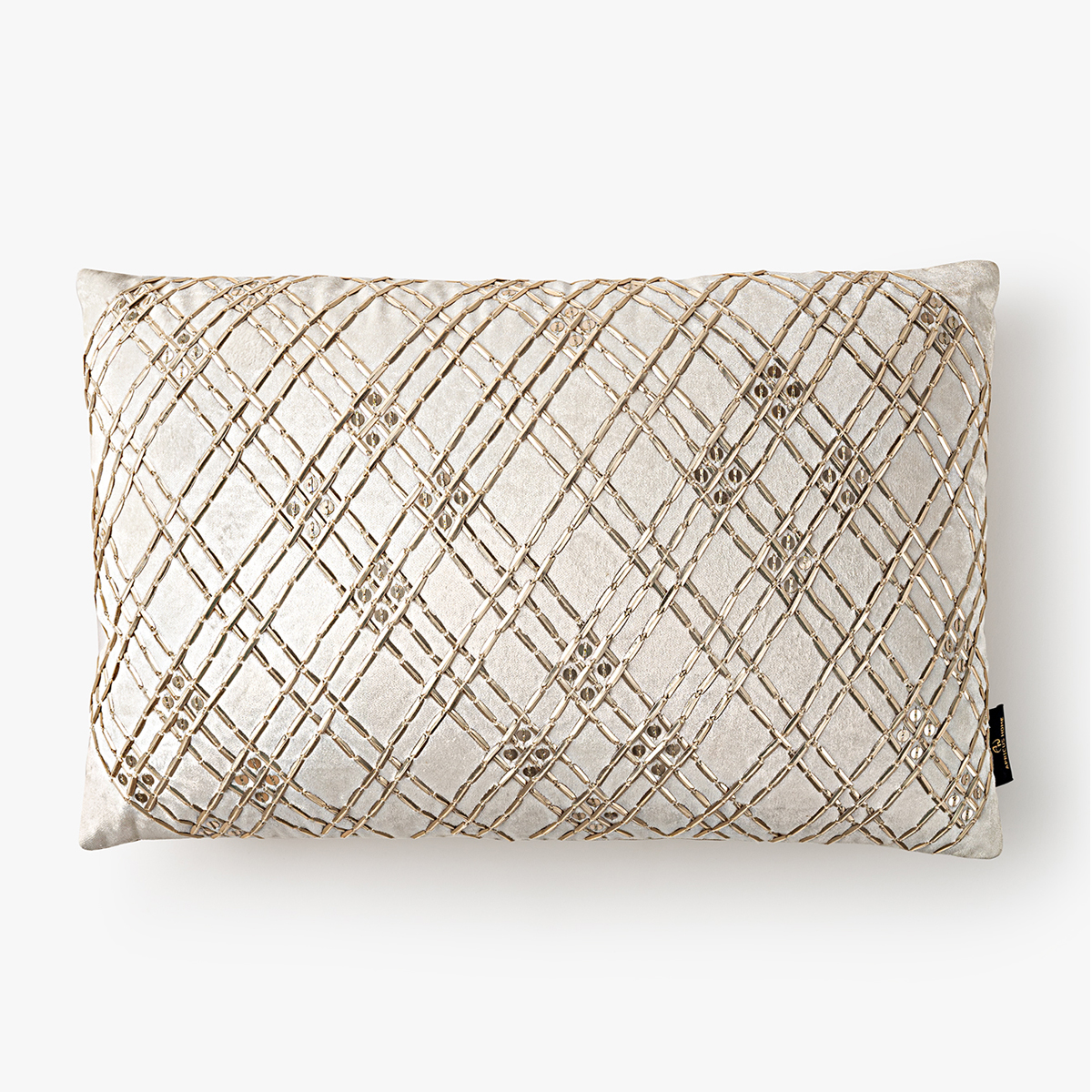 - The design is subtly embroidered in a contrasting warm tone, likely gold or bronze, on a light, neutral fabric, suggesting a plush material like velvet or a fine weave.