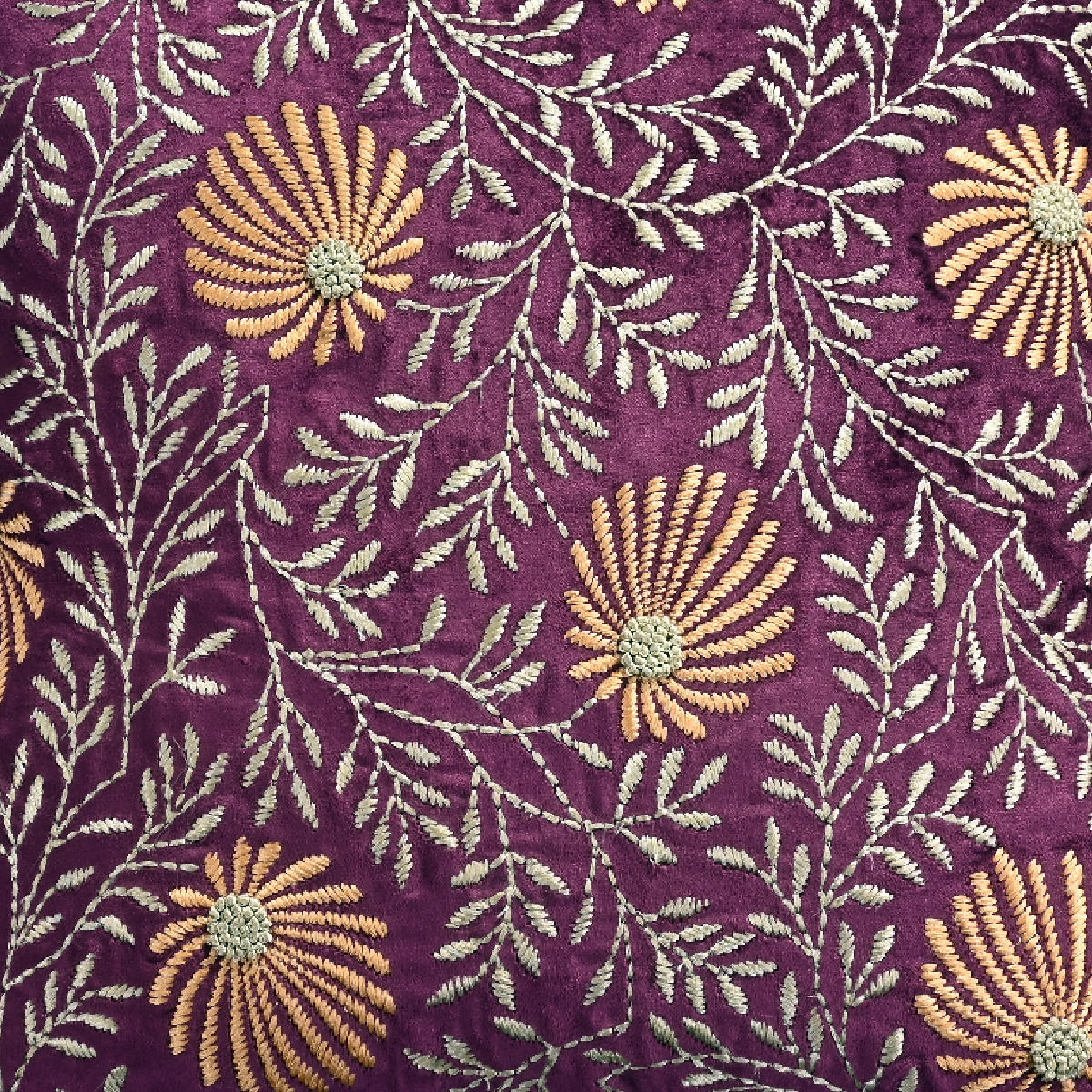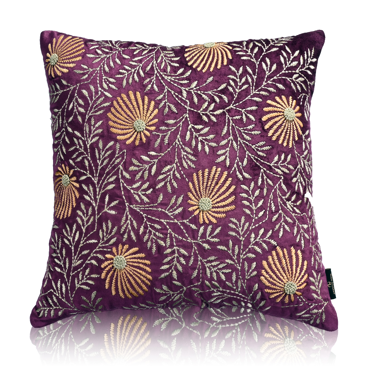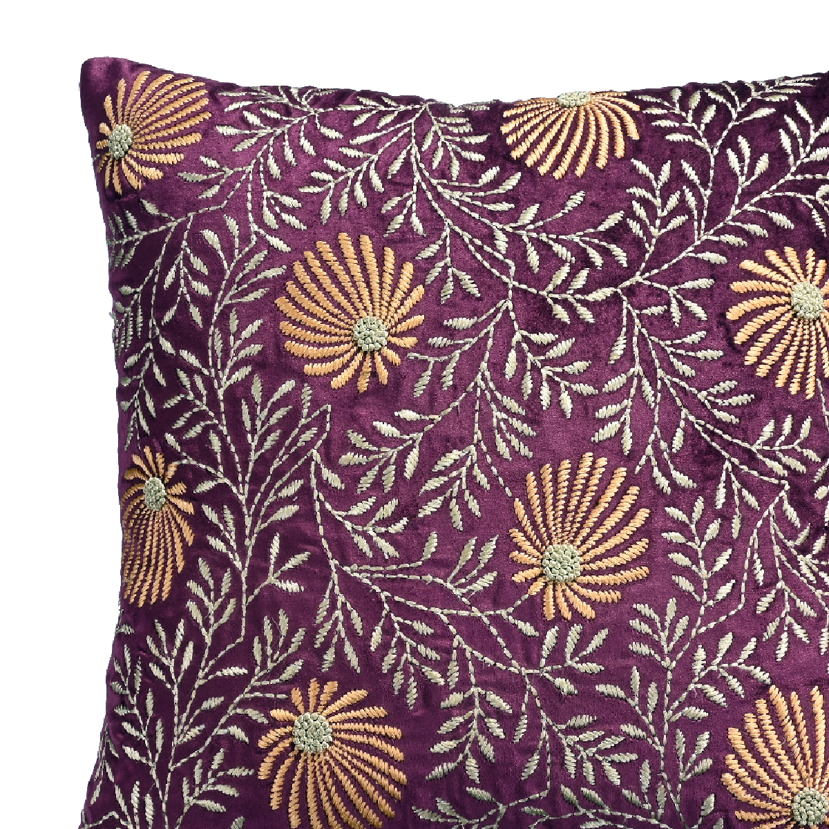 - Intricately embroidered cushion cover in rich royal purple adds a regal charm to any setting.