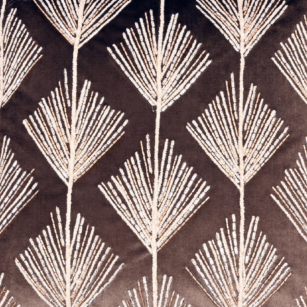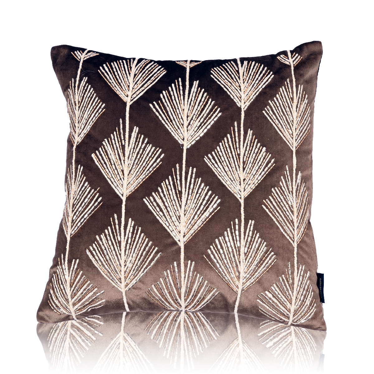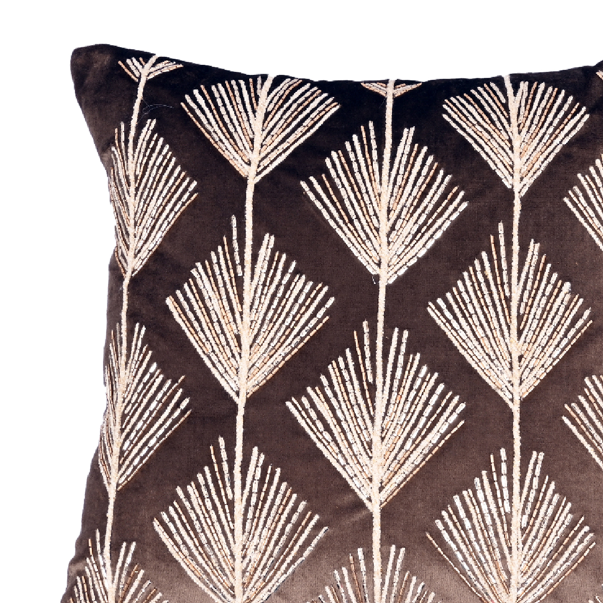 - Decorated with hand-embroidered pine leaves on velvet cushion covers, the design draws inspiration from nature.