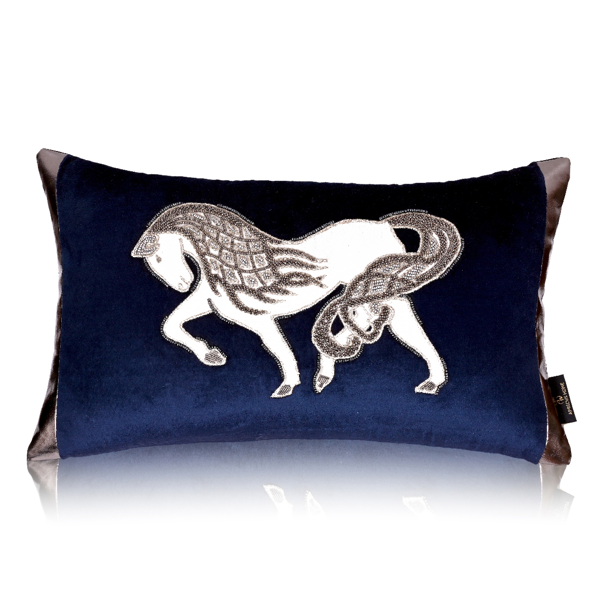 • The stallion made of white patchwork with gold embroidery on a navy blue velvet cushion is a must-have!