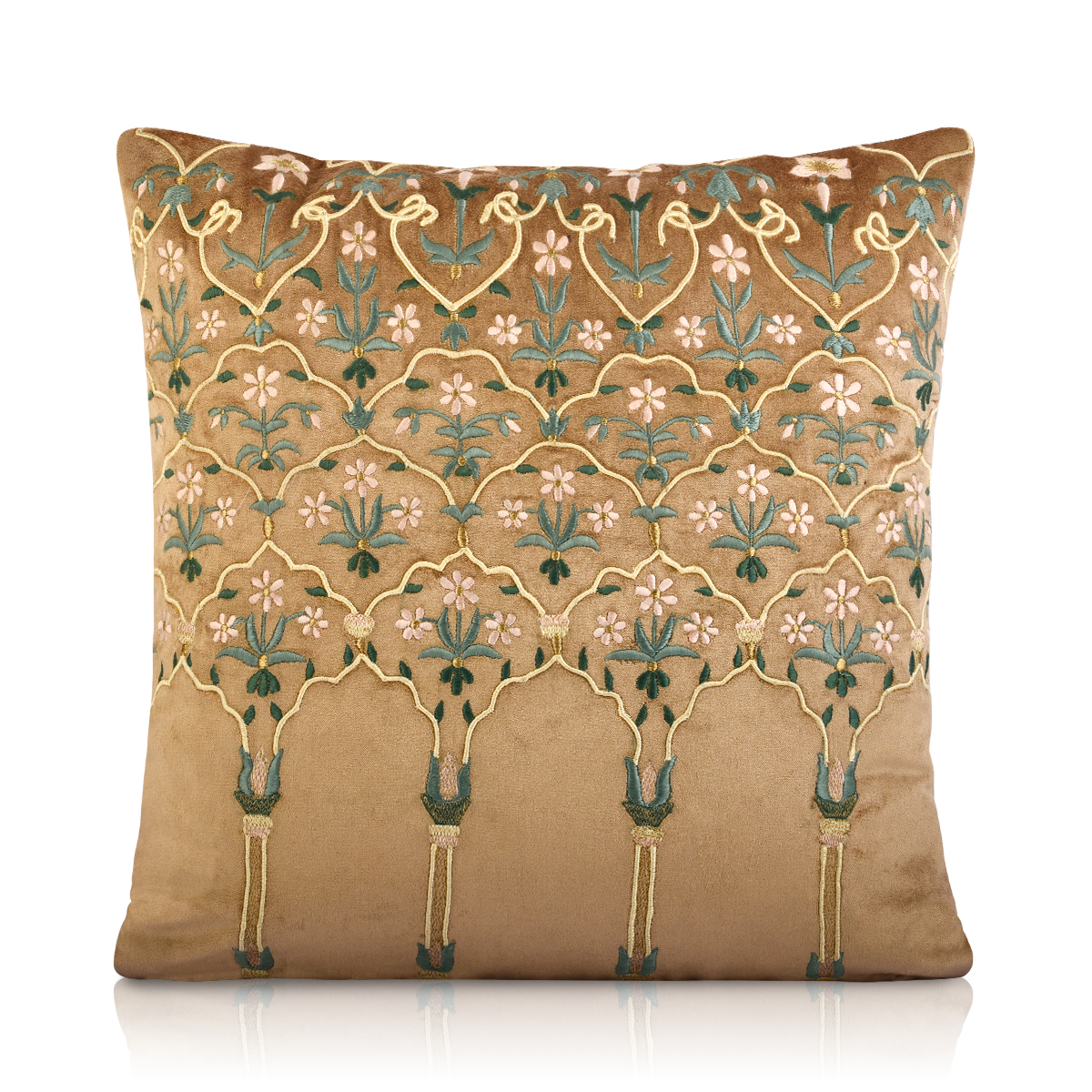 Inspired by the grandeur of Mughal architecture, this cushion cover showcases elegant white, grey, and gold hues on a refined beige base, adding a regal touch to any space.