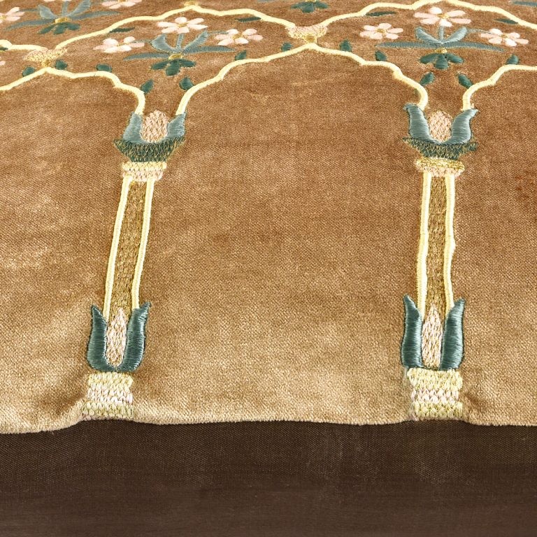 The embroidered motifs are set against a textured surface, adding depth and a luxurious feel.